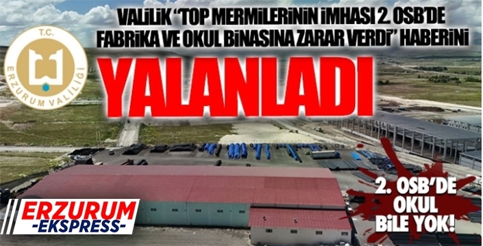 Erzurum Valiliği, Aziziye İlçesi'nde yeni kurulan 2. Organize Sanayi Bölgesi'nde (OSB) bulunan top mermilerinin imhası nedeniyle bazı fabrika ve okul binalarının hasar gördüğü yönünde yapılan haberleri yalanladı. Erzurum'da günlük olarak yayınlanan bir gazete ve bu gazeteye ait sosyal medya mecralarında yayınlanan haberlerde konu edilen iddiaları yalanlayan Erzurum Valiliği, yazı bir açıklama yayınladı.