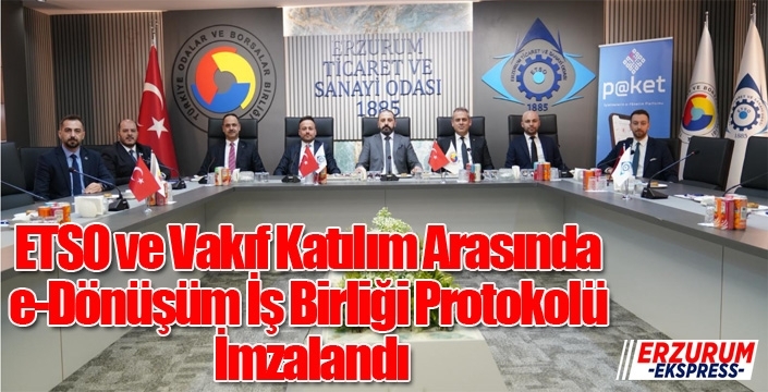 İş birliği protokolü; ETSO Yönetim Kurulu Başkanvekili Serhat Kılıç, Vakıf Katılım Karadeniz Bölge Müdürü Ekrem Aydın, Vakıf Katılım Erzurum Şube Müdürü Nurettin Önay ve ETSO Genel Sekreteri Osman Ömeroğlu'nun katılımlarıyla imza altına alındı.